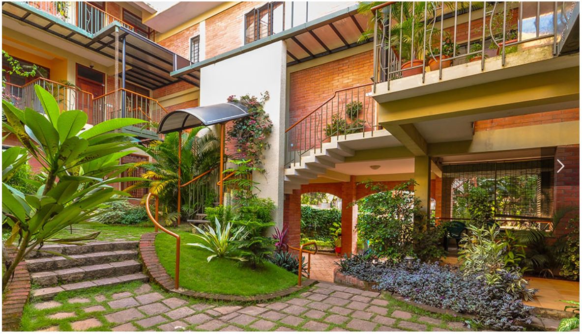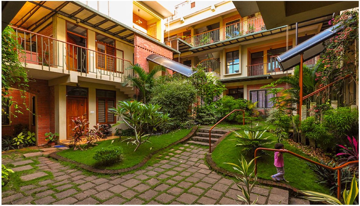 Good Earth Hermitage is an elevated site surrounded by greens, slightly off Mavoor Road, Calicut. The use of the terraced site profile enabled segregation of the vehicular movement and living spaces above. The arrival is to the children’s play area from which one moves on to the central court.Based on the ‘Naalukettu’ traditional planning, a central court is the focus and transitional access space to all the 4 blocks around it. A multi dwelling unit with Duplex unit in each block. The central court becomes the rendezvous for children and grown ups alike.