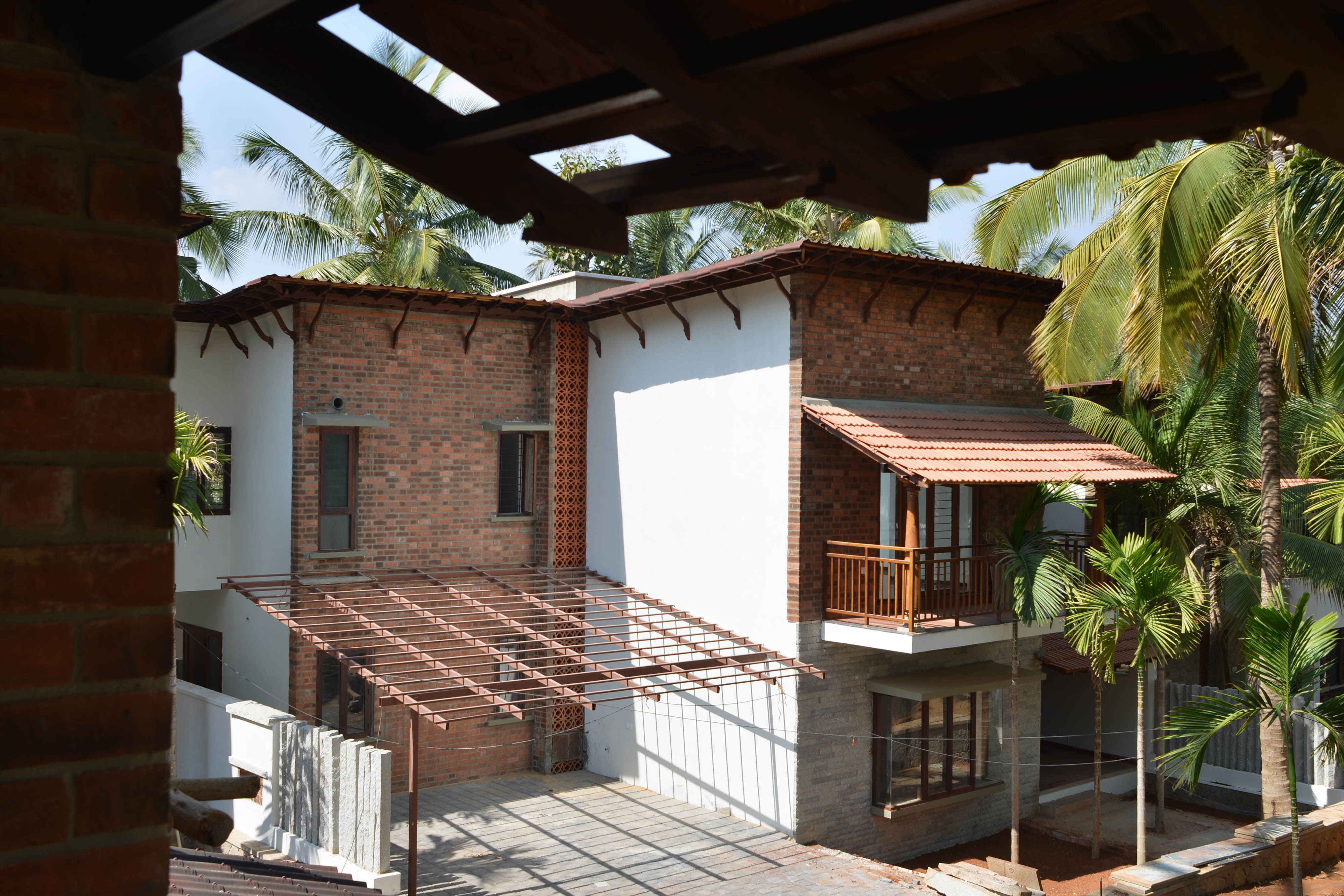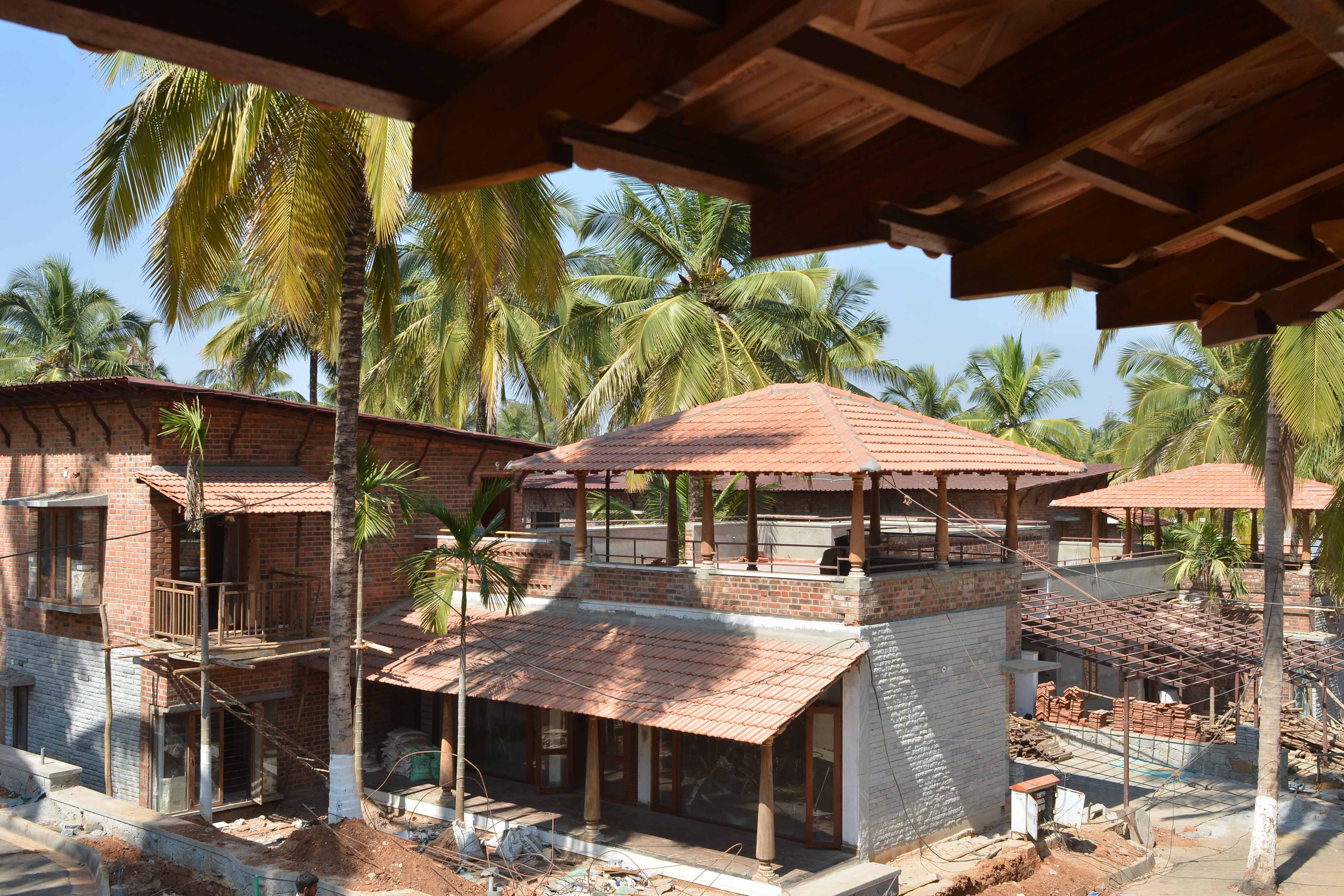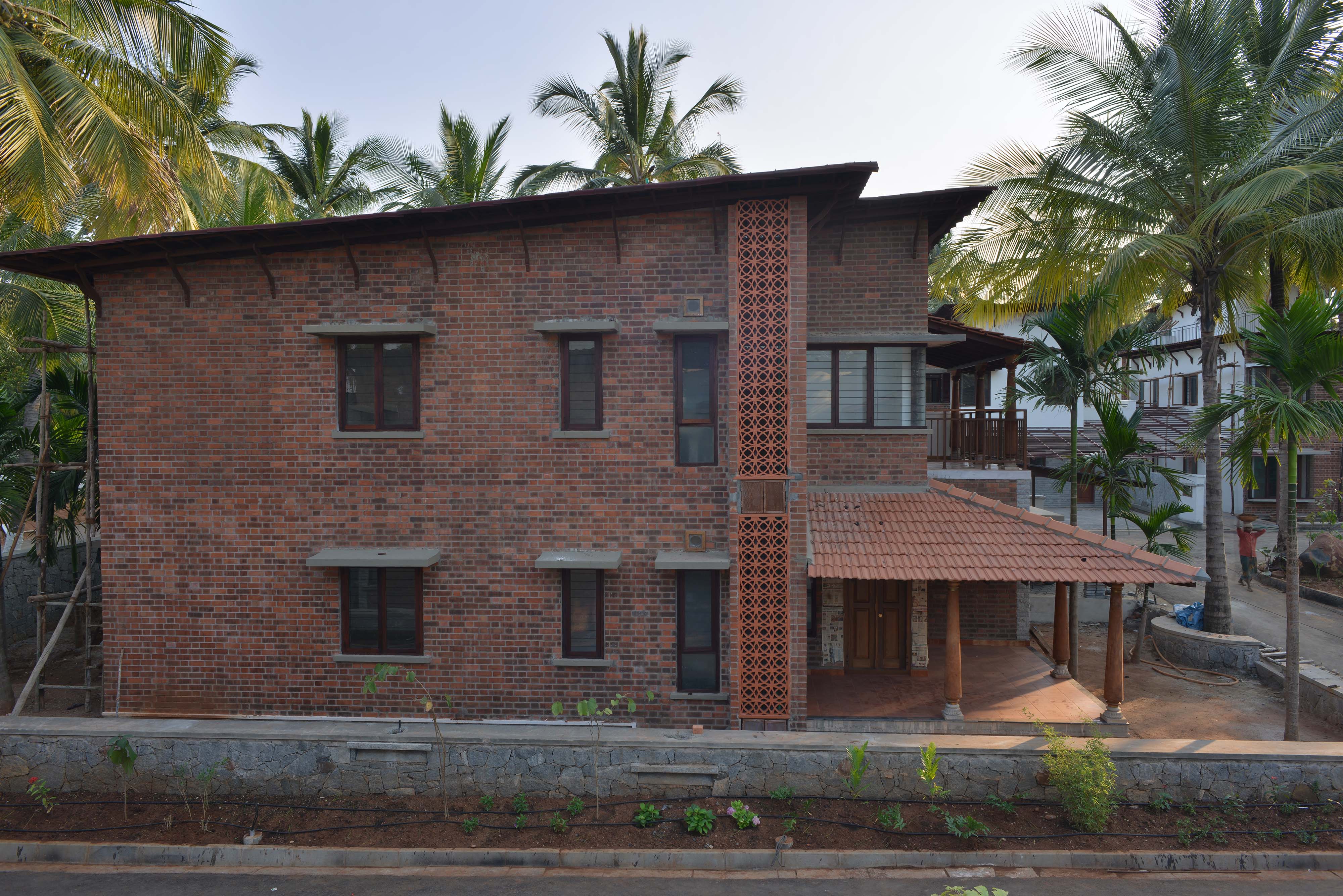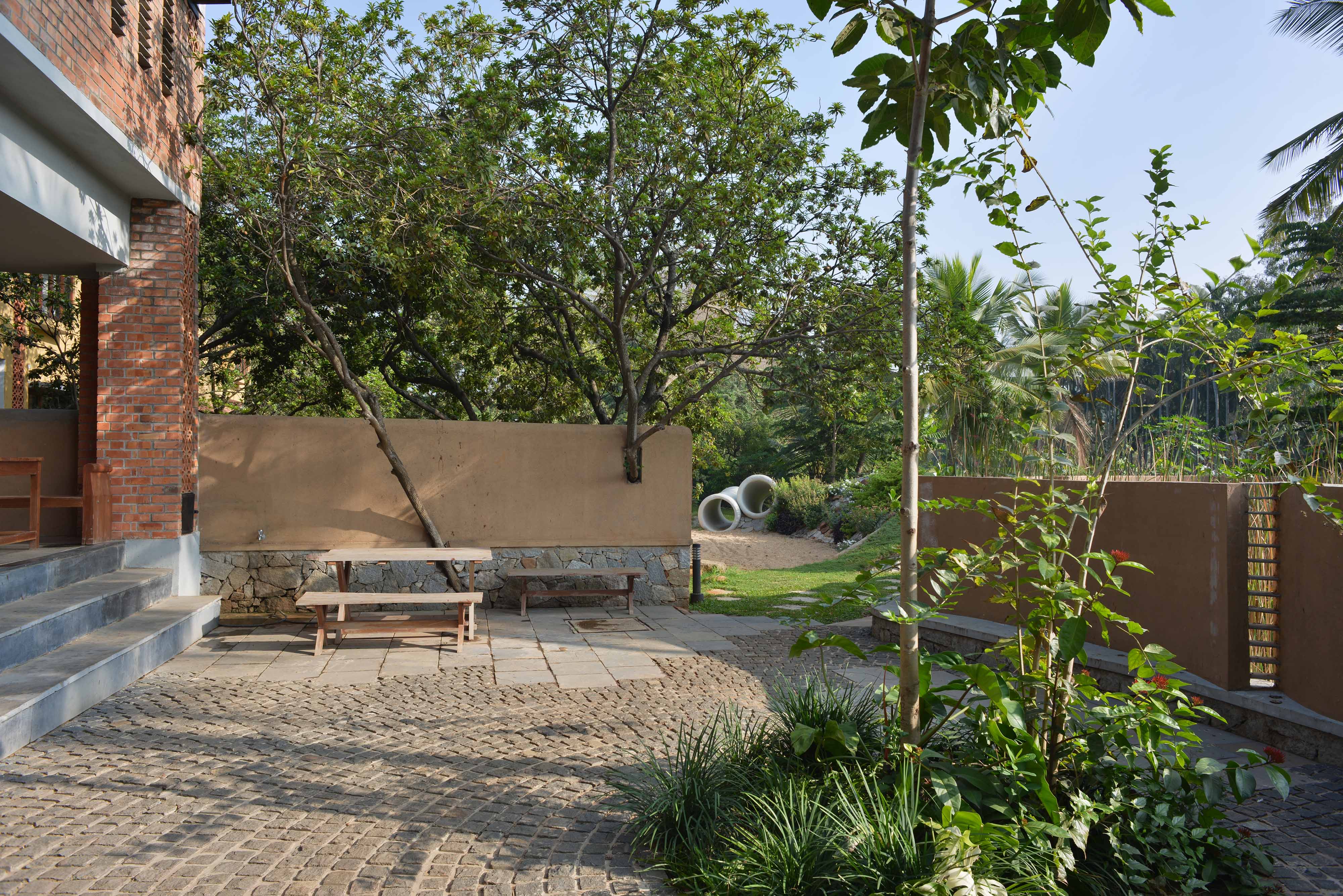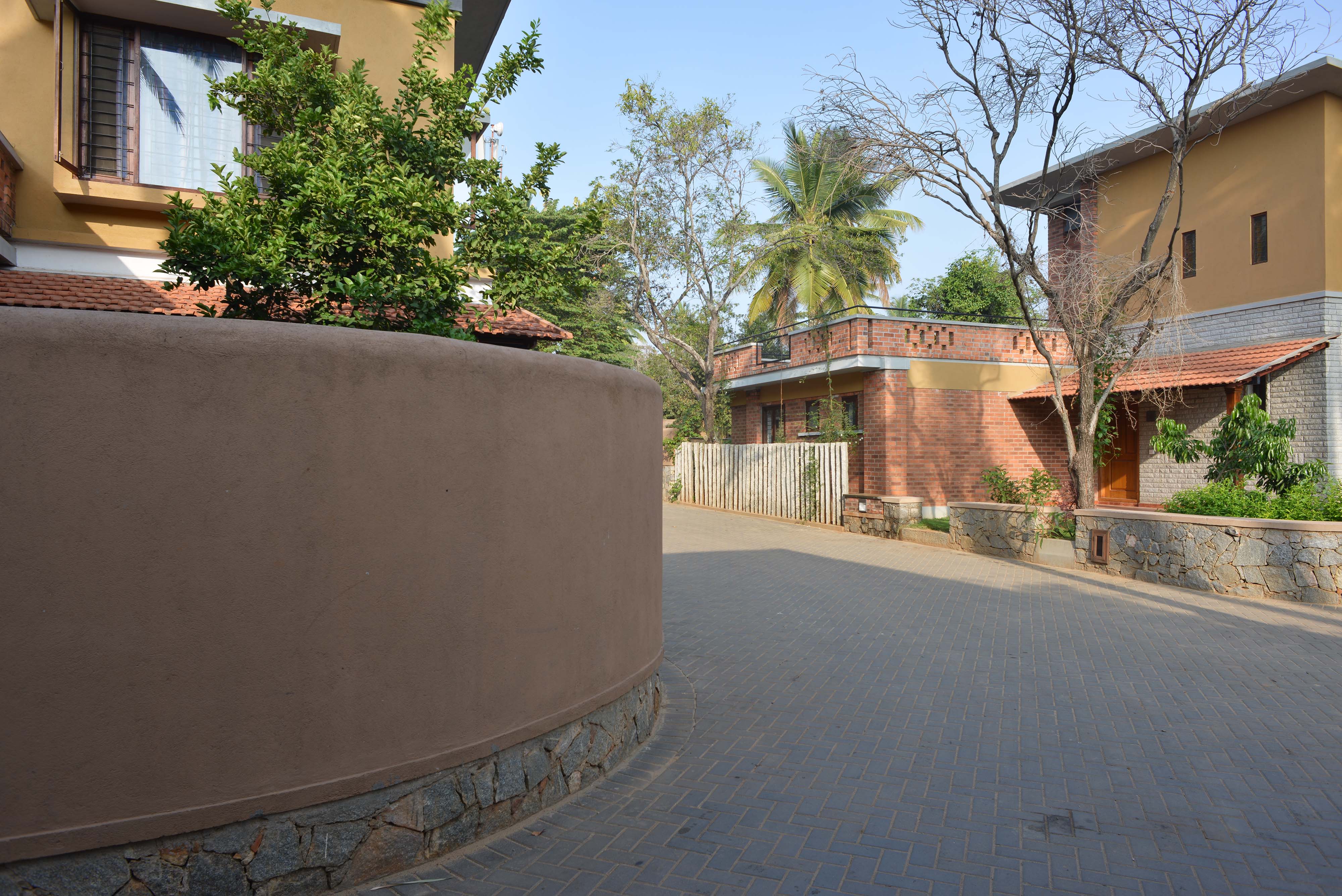 The spaces have been sensitively designed keeping in mind the necessity to stay connected to the ground. Hence, the built up is only one floor above the ground structure with plenty of open spaces and balconies, surrounded by lush vegetation. The houses are designed around a courtyard with verandas. The interior spaces within a house have minimum walls and flow into each other. The double-height staircase is an integral part of the house, and connects the two floors. The spacious bedrooms too overlook the open courtyard. The house is designed to allow adequate light and cross ventilation. Natural textures and warm tones, with space for individual expression, make each house unique.
